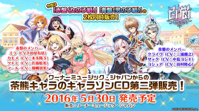 2016年1月27日(水)に発売された人気スマートフォンゲーム「白猫プロジェクト」のイベント『茶熊学園』初の公式CD「校歌斉唱!私立茶熊学園/茶熊学園生徒一同と学長」に続き、2016年5月30日(月)にAmazon.co.jp限定で、『新入生歓迎!私立茶熊学園 赤盤』『新入生歓迎!私立茶熊学園 青盤』が同時発売されることが決定した。
