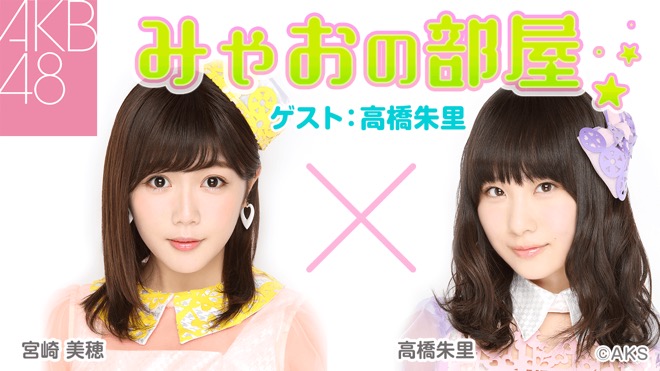 4月21日(木)21時よりスタートするこのレギュラー番組は、隔週でSHOWROOM公式スタジオより配信。ライブイベント<リクエストアワー2016>の人気コーナー「みゃおの部屋」をSHOWROOM上で再現し、AKB48グループから毎回ゲストメンバーを招いて女子会トークを繰り広げる。第一回ゲストには、Team4キャプテンの高橋朱里が登場する。