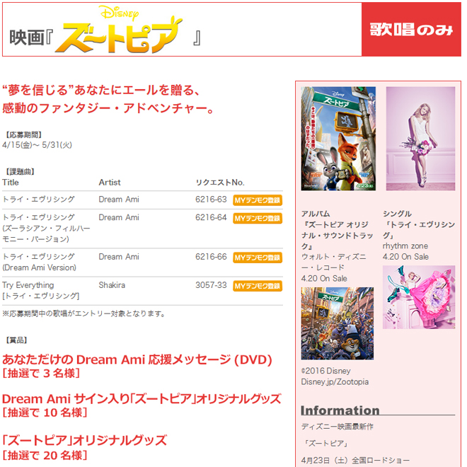 ディズニー映画『ズートピア』主題歌を歌ってDream Ami応援メッセージDVDや映画グッズをもらおう!