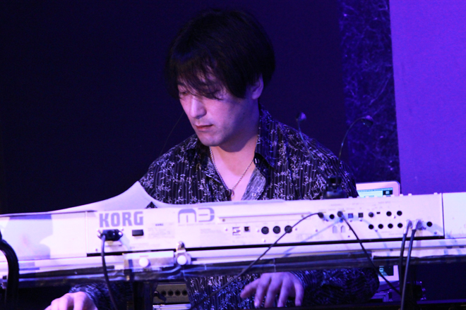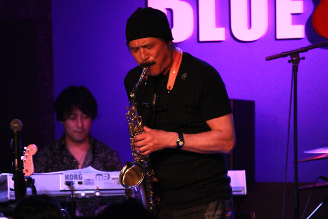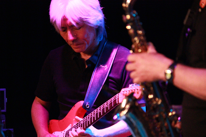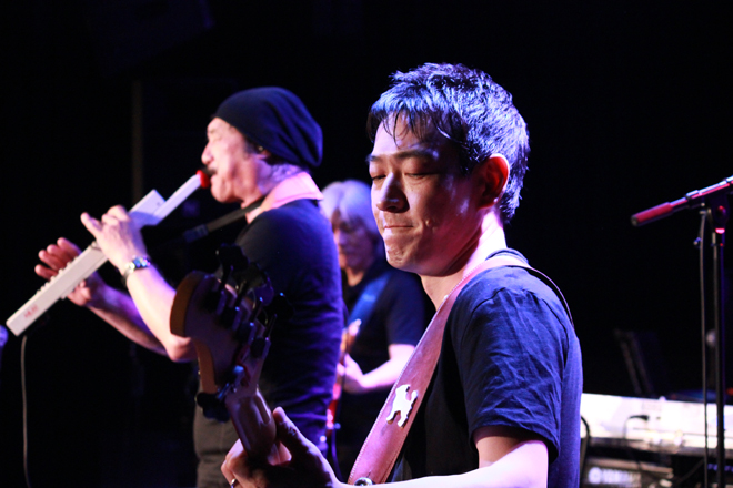 2005年のアルバム『Passion Flower』からの「Barefoot Beauty」は、元気ハツラツのポップ・チューン。河野の弾くキーボードの爽快な音色が、涼風のごとく耳元を吹き抜ける。一転して「Behind Lavender」(2010年『時間旅行』より)は、よく弾むラグタイム風のピアノをイントロに配し、バンド全体が粘っこいグルーヴを聴かせる長尺ファンク・チューン。田中が長いソロをばっちり決めて大拍手を浴びると、安藤も負けじとアームを駆使した熱烈なソロを披露。フックではギター、サックス、キーボードがユニゾンのフレーズを繰り出して大いに盛り上げ、長い曲をまったく長く感じさせない。そして「本編最後に去年のアルバム『Paradise』からの曲を」という伊東の言葉と共に、強力にキャッチーなメロディを持つファンク/ロック・チューン「Mystic Island」と、さらにアッパーでファンキーな「Through The Thunderhead」を立て続けに。終わり近く、坂東が繰り出した千手観音のごとき猛烈なプレーには唖然呆然。前半6曲、後半4曲、新曲も代表曲も入り乱れ、大満足の80分だ。