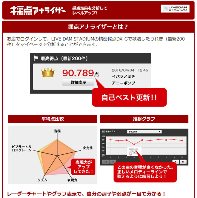 「メロディーどおりに歌えているか」、「こぶしやビブラートが使えたか」といった採点で人気の「精密採点DX-G」を、歌の調子のバロメーターとしている人もいるはず。そんな人にぜひ使ってほしいのが「採点アナライザー」。LIVE DAM STADIUMの精密採点DX-Gで歌唱した「りれき」をDAM★とものマイページで分析できることができるサービスだ(お店での歌唱時にはログインが必要)。