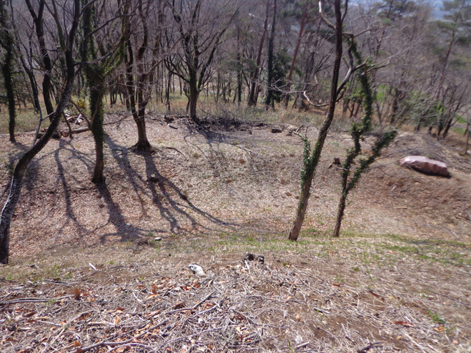 そのまま通り過ぎ、大手の方から回って三日月堀を目指す登り口から城に入城してほしい。ここが本来の城の正面玄関なのである。三日月堀はその名の通り、三日月の形をした馬出しの外に作られた堀である。コンバースのジャックパーセルのスマイルラインと瓜二つだ。土砂でずいぶんと浅くなってしまっているが、当時はもっと深かったであろう。大手口のインパクトとしていきなりこういう形のした堀があることがナイスセンスだ。三日月の形をしたおかげで馬出しも丸馬出しという呼び名になっていることもうなずける。その先に虎口が二つあり堂々とした大手門の跡である。土塁の崩れもあるが構えとしては威圧感が十二分に伝わってくる。