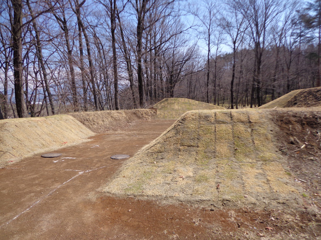 さて、ここからの戻りが新府城の面白さのひとつである。もう一度本丸の虎口に戻り、二の丸を横切り、搦手方面に進むと途中にどでかい蟻地獄のような井戸跡がある。生活する上で水の確保は鉄板だ。今は卓偉の才能のように埋もれてしまっているが、発掘調査ではどれだけ掘っても水が出て来なかったらしいので当時は崖の下の平地と同じとこまで掘って(いわゆるジョン・オーツまで掘って)釜無川の水を横から流し込んでいたと推測。素晴らしい。井戸を超えると搦手の桝形虎口、空堀、水堀が表れる。ここの発掘調査と土塁の復元のディティールは素晴らしい、拍手である。搦手門の基礎石などリアル感が満載である。凄いのは左手は全部崖、にも拘らずこの場所にも堀が存在すること、どんだけ防御すんだ!仮にこの崖を敵が登って来たとして(登れるわけないし登る気にすらならんが)やっとの思いで登った先に、こんな上にも水堀があんのかい!と突っ込みたくなる。この水もやはりその井戸から水を引っ張って堀に流したんではないだろうか?いやそれはさすがに無理があるか、などとイマジンするともうたまらない。
