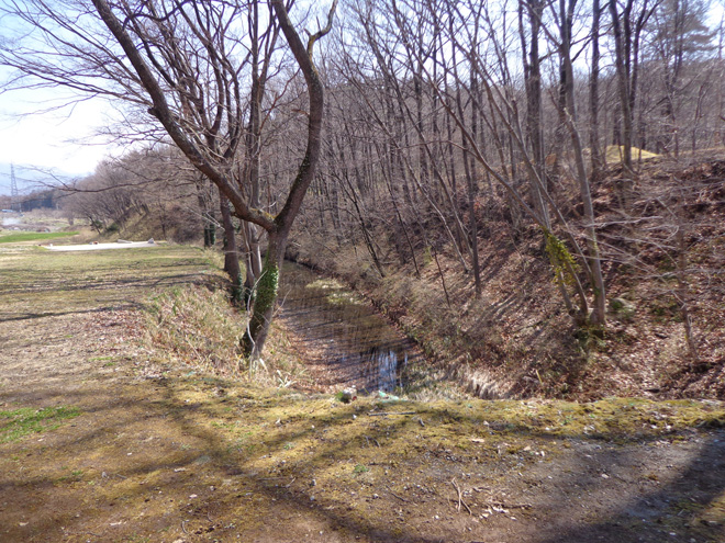 よくよく考えてみると新府城、現在はこの搦手口の方が見学の見所が満載である。そこから駐車場方面に堀に沿って歩いて行くと、土塁が出っ張っているのがわかるが、これが新府城の一番の見所である「出構」である(でがまえと読む)。現在は出構はこの外堀に二つ存在する。機能については諸説あるが、堀を渡ろうとする敵を打ち払う為の射撃陣地と言ったところだろうか。まるで能舞台のようである。