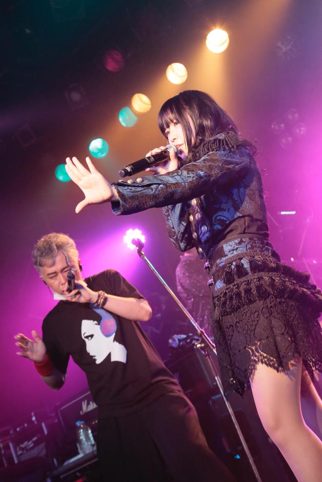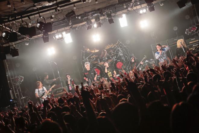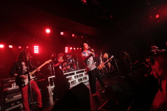 「今年初の筋肉少女帯ワンマンライブだぜー!声を限りにオーディエンスが歌ってくれよー!」と大槻が煽る。彼のMCは本日も絶好調だ。おもしろトークと抜群の演奏力が巧みに融合した筋肉少女帯のライブは、何度観ても刺激的。序盤は内田が味わい深い歌声を披露する「モコモコボンボン」、本城の華やかなヴォーカルを堪能できる「LIVE HOUSE」、橘高がアグレッシブに叫ぶ「スラッシュ禅問答」で観客のハートに火をつける展開に。この時点で十分にスペシャル感のあるライブだが、ここからが更に凄かった。まずは筋少の定番中の定番「日本印度化計画」で人間椅子のドラマー、ナカジマノブがパワフルな歌声を轟かせ、フロアの大歓声に応える。続いてのサプライズは、声優・野水いおりを迎えての「球体関節人形の夜」。大槻作詞、橘高作曲で楽曲提供したこの曲でコラボした野水は、熱烈な筋少ファン。憧れのメンバーたちに囲まれてロマンチックな華を咲かせる彼女に惜しみない拍手が送られる。ゲストを迎えてのまさかの展開は、これで終わらなかった。大槻の紹介に導かれ、LOUDNESS/X.Y.Z.→Aでヴォーカルを務める二井原実が登場し、「イワンのばか」を熱唱。問答無用の迫力が場内を支配し、オーディエンスは狂喜乱舞する。