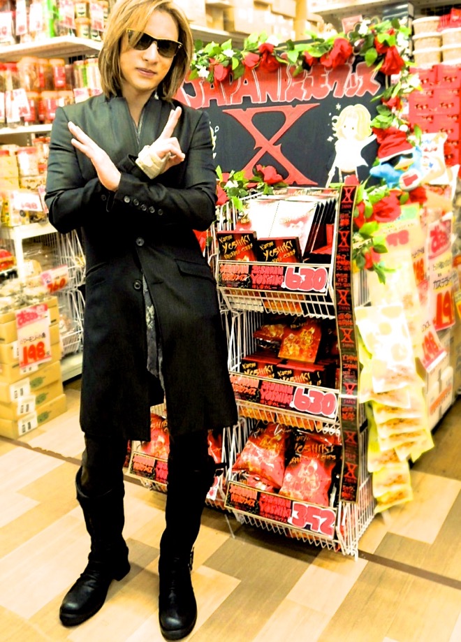 先日、ドン・キホーテ 新宿明治通り店での取り扱いが始まったX JAPAN限定グッズの「X JAPAN YOSHIKI伝説 キレ辛カレー」と「X JAPAN YOSHIKI伝説 キレ辛カレーチップス」。YOSHIKIも先日店舗に足を運び、陳列されている棚を前にXポーズを決めた。