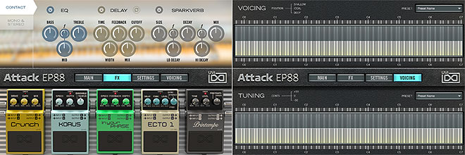 「Attack EP88」は88鍵モデルのRhodes Mark Iをベースにし、ブラス製の画鋲(タック)をハンマーに装着することで美しい鈴鳴りの響きが特徴のサウンドを生み出す。これにより、従来のエレクトリックピアノ音源とは一線を画した応用力と存在感のある音色が魅力となっている。