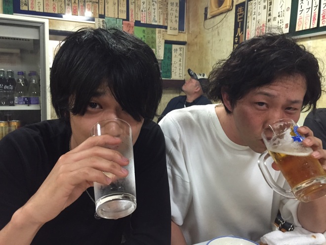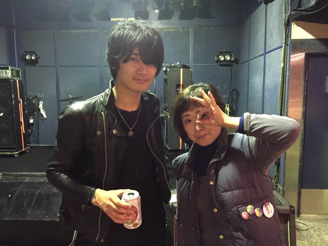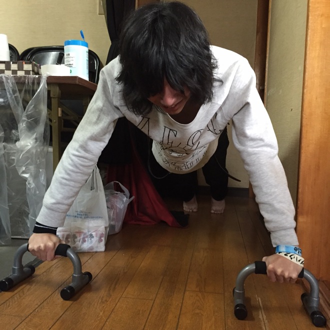 岡山PEPPER LANDの楽屋は、普通の民家の一角にある。ふと横を見れば、また今日もキョウスケとマネージャーが筋力トレーニングをしている。このツアー中はずっと、腹筋を鍛える器具だの腕立て伏せを効率よくする為の器具だのが楽屋に転がってるのだ。運動部の部室みたいに。