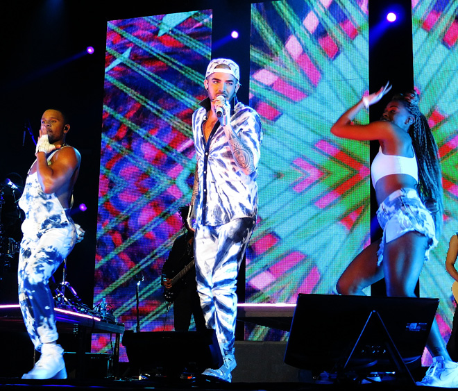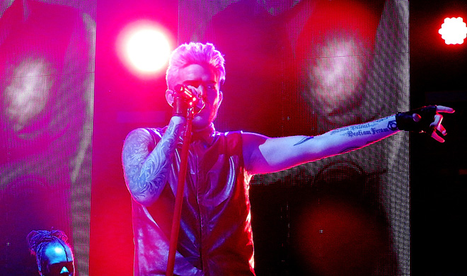 そしていよいよヘルシンキ公演がスタート!すでにおなじみになったイントロが聴こえてくるとバックスクリーンに映像が映し出されます。このツアーのオープニングナンバーは「Evil In The Night」でかなりダークにスタート!フィンランドでは大ヒットしたデビューアルバムからの「For Your Entertainment」、そのあと最新アルバムからの大ヒットとなった「Ghost Town」とダークにクールに続くあたりは息が抜けません。このあと日本ツアーではまだ発表になってなかった3月の「アメリカンアイドル」出演でお披露目したスウェーデンのシンガーソングライターLalehとのデュエット曲「WelcomeTo The Show」が入ります。ツアーではUSツアーでのLA一公演をのぞいて一人で歌っていますが、「俺のショーにようこそ!」という意味で、単独ライブではもしろ1人で歌うほうが彼の世界にぐぐっと引き込まれていく感じがします。
