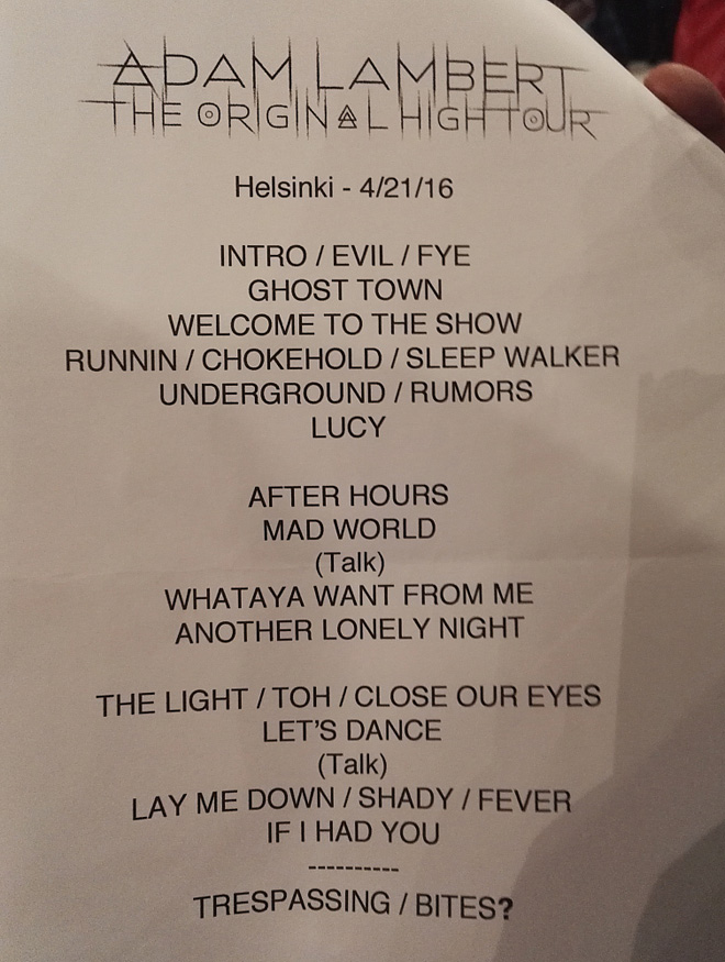 アンコールは「Trespassing」とアダムの単独ライブではおなじみとなったQueenの「Another One Bites The Dust」。間に楽しくバンド紹介がはいり、ヘルシンキ公演終了。アダム・ランバートの歌唱力と声量はとにかくすごい!そして歌がうまいだけではありません。彼は観客の目を楽しませてくれる素晴らしいパフォーマーでありエンターティナーでもあります。素晴らしいショーをありがとう!そして6月にはQueen + Adam Lambert としてヘルシンキ公演が予定されています。チケットはすでにほぼソールドアウト!この公演も今からすごく楽しみです。