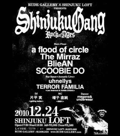 Scoobie Doとのライブで特に印象深いのは、HISAYO姐さん加入の時のライブ。新宿LOFTで行われたRUDE GALLERY主催のイベント(※2010.12.24@新宿LOFT<RUDE GALLERY x SHINJUKU LOFT presents「SHINJUKU GANG Rock of Ages」>)で、クリスマス・イブだった。俺達にとってはそれが姐さん加入後初めてのライブでね。出演バンドはThe MirrazやBlieANやuhnellys、そしてScoobie Doがいたんだ。あと、司会進行役がいて、サンタクロースの格好をした怒髪天の増子さん(泥酔)。サンタの衣装より顔が赤かったね……つまり、イベント自体は楽しいパーティのはずだった。けど、あの時のライブは今でもメンバーの間で語り種になるくらい、緊張感に満ちたものだった。