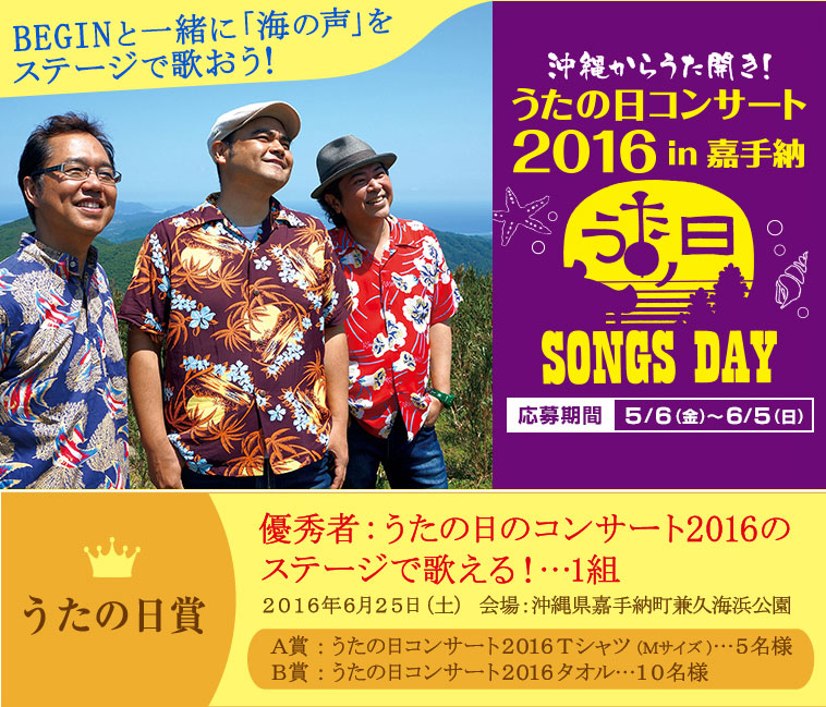 6月26日(土)に開催される<沖縄からうた開き!うたの日コンサート2016 in 嘉手納>のステージでBEGINと一緒に歌えるビッグチャンス! DAM★ともで『BEGINと一緒に「海の声」をステージで歌おう!オーディション』がスタートした。