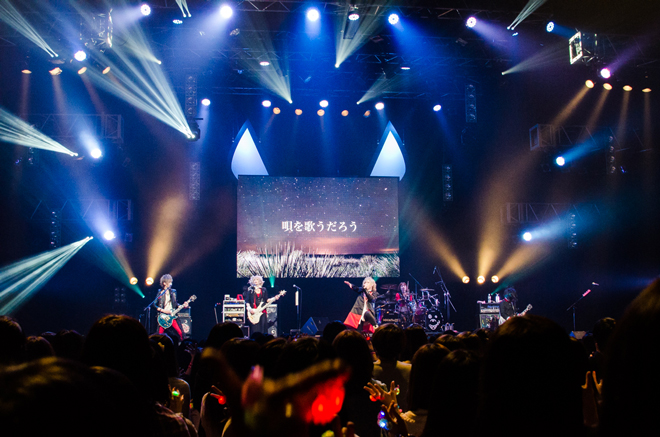 場内のモニターにはファンへの感謝の言葉が映し出され、日本全国47都道府県でDOGを愛する全ての人々と繋がるプロジェクト“project『Love』”を始動すること。“いつだって愛に来いよ、どこだって愛に行くよ”を合言葉に、1年中日本全国でライブを行い、並行して音源をリリースするという重大発表から第2部の“プレミアムわんマン”がスタート。喜びの声が湧き上がる場内に間髪入れずおなじみのSEが流れ、天井から降るカラフルなバルーンと共に「Doggy’s Party!!」へ。101曲を披露したツアーの成果か、春(Vo)の歌声は絶好調に伸び上がり、楽器隊の演奏も生々しい躍動感を備えて、キャッチーなムードと共にバンドとしての凄みも提示する。また、本日はニコニコ生放送内の人気番組「ニコびじゅ」とのコラボ公演ということで、「チューリップ中毒」では人気絵師の五月病マリオ氏がリアルタイムで5人の絵を描き、それが巨大な犬型モニターに映し出される場面も。シングル曲&定番曲を中心に厳選されたセットリストと進化した表現力は、DOG楽曲の根にあるリアルなメッセージと切ない響きを際立たせ、ミズキ(G)もMCで「絆が深まった今のDOGは凄いよ」と感涙しながら語ったが、それは彼らのパフォーマンスからもハッキリ伝わってきた。DOGの楽曲は“良い曲”ばかり――その事実をこんなにも実感させてくれたワンマンはかつて無かっただろう。