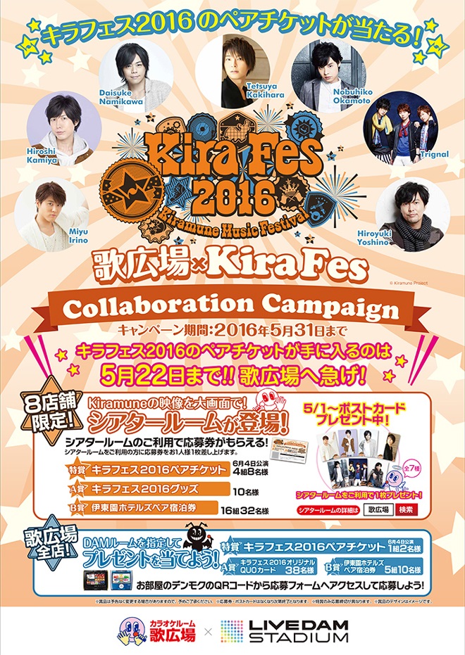 公演に先立って、カラオケルーム歌広場で4月11日から大好評展開中のキラフェスコラボキャンペーン。特賞賞品として<キラフェス2016>のペアチケットを豪華にも5組10名様へプレゼントしてくれるのがこのキャンペーンだ。
