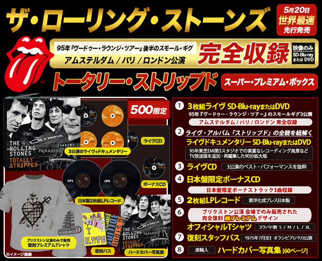完全数量限定盤には、パラディソ(アムステルダム)、オランピア劇場(パリ)、ブリクストン・アカデミー(ロンドン)各公演がフル収録されSD-Blu-rayもしくはDVDが付属しており、ストーンズファンが長年の間夢想するしか無かった光景がついに明らかになる、単なるドキュメンタリーに留まらない歴史的資料の高い作品となっている。