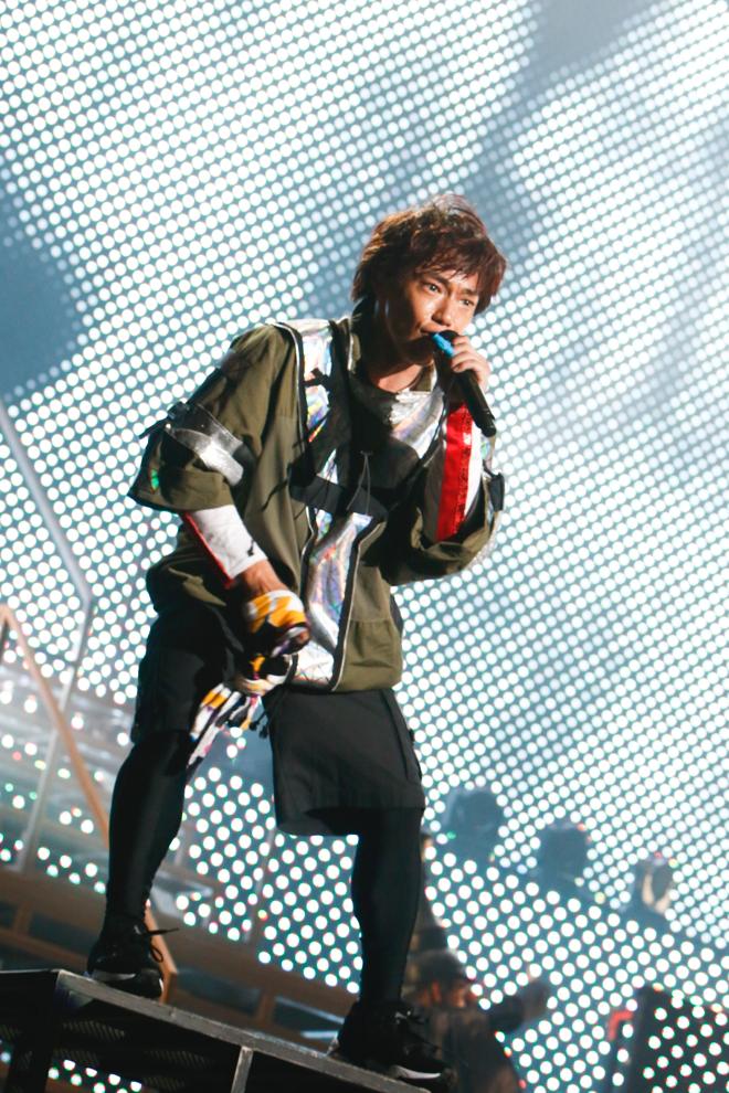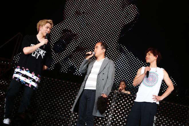 アンコールの2曲目にパフォーマンスされた最新曲「ONE-SIDED LOVE」(5月18日発売)では、同曲のミュージックビデオに出演したトレンディエンジェルの“斎藤さん”こと斎藤司がサプライズ出演。ミュージックビデオやジャケットで披露しているふさふさのカツラを装着した姿で、大サビ前にある“落ちサビ”と呼ばれる一番おいしい部分をかっさらって熱唱し、大歓声を浴びた。