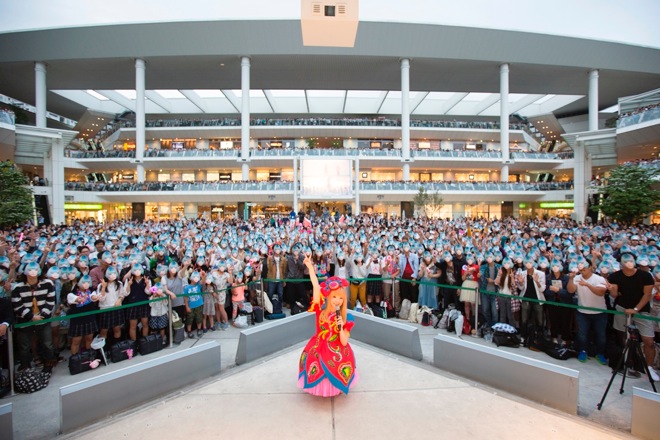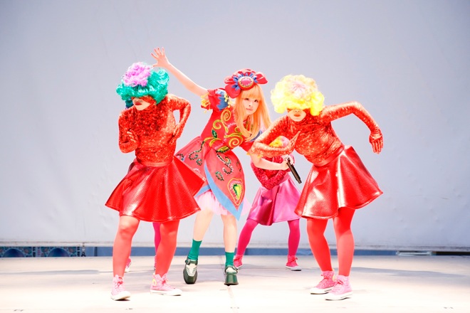 今回行われたイベントは、1年ぶりという久し振りのフリーライブとなった。ベストアルバムのイントロ曲「KPP ON STAGE」が流れ始めると客席からは自然と手拍子が起こり、ダンサーと共に<KPP 5iVE YEARS MONSTER WORLD TOUR 2016>の衣装のきゃりーぱみゅぱみゅが登場した瞬間、悲鳴のような声援が上がった。