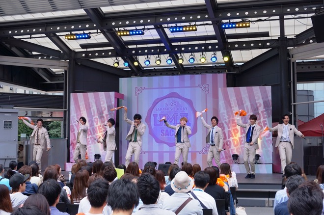 <UMA SACAS>は日本ダービーに向けて行なわれるイベント。オ-プニングライブで登場したSOLIDEMOは、UMA SACASテーマソングとなった新曲「Stay with me」を初披露し、タオルを回しながらファンの声援に応えて熱唱。その後もテープカットやトークショーに参加するなどPR大使としてイベントを盛り上げた。
