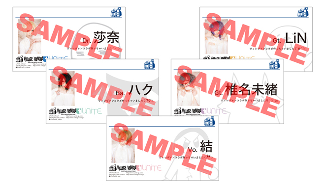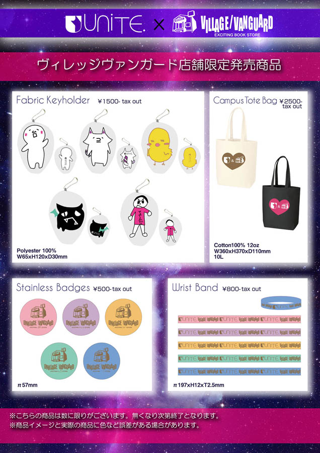 今年3月にユナイトの結成5周年を記念して、メンバーデザインによるコラボグッズが全国のヴィレッジヴァンガードで販売され、大好評でほぼ売り切れとなっていたが、再度ユナイト×ヴィレッジヴァンガードのコラボが実現した。前回は新宿マルイアネックス店、横浜ルミネ店、町田ルミネ店の3店舗で販売スタート、メンバーデザインによるキーホルダーやトートバック、メンバーカラーの缶バッチやラバーバンドなどのコラボグッズを販売。3月27日からはビレッジヴァンガード全国21店舗でも販売された。今回は逆に、ビレッジヴァンガードがユナイトのライヴ会場に出店してコラボグッズを販売する。CDとあわせて3,000円以上の購入者には、ランダムで“会場限定オリジナルメンバーコラボ名刺”が特典として付くとのこと。(ユナイトオフィシャルグッズとは別会計)