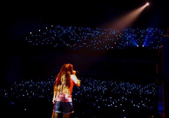 本編を「Rin」で締めくくると、バンドメンバーたちと共にステージを後にした浜田。彼女を讃える「麻里! 麻里!」というコールとハンドクラップが激しい。その声に応えたアンコールでは「Historia」「Carpe Diem」「Orion」が披露されたが、観客の興奮は全く収まる気配がなく、ダブルアンコールが行われた。まず、このライヴの模様がWOWOWで9月に放送されるということ、追加公演が7月18日に行われる旨を語った後、浜田はバンドメンバーたちを紹介。増崎孝司(G)、藤井陽一(G)、若井望(G)、山田“YOU”友則(B)、増田隆宣(Key)、宮脇“JOE”知史(Dr)、中尾昌史(Key&Mp)、絵里(Cho)…各人に関するエピソードを添えて語る姿からは、深い愛情と信頼が窺われた。メンバーたちも彼女のことが大好きなのだろう。ギタリストの増崎はステージの模様を撮っていたテレビカメラにスマートフォンの画面を向けた。大型スクリーンに映し出されたのは「7/18は麻里ちゃんの誕生日。みんなでお祝いしよう!」という文字。用意されていたこの粋なメッセージは、浜田にとって一足早い心温まる誕生日プレゼントになったのではないだろうか。