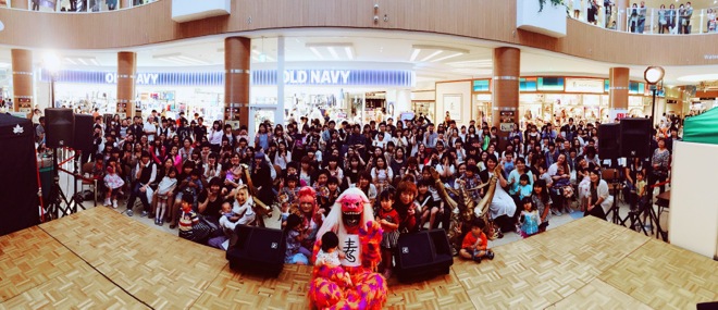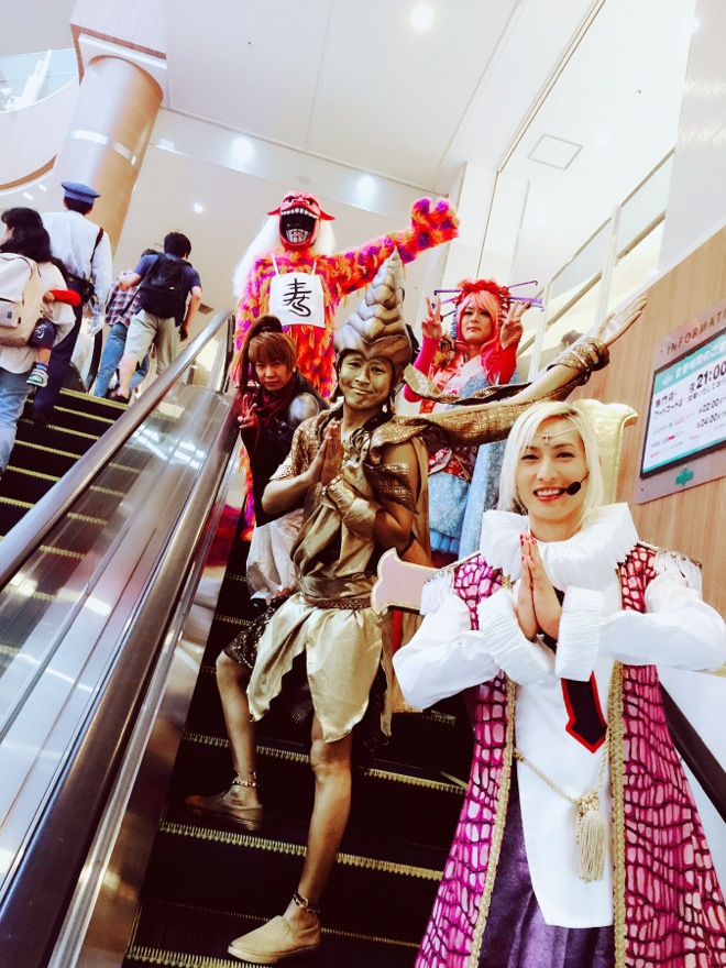 3階まで吹き抜けたショッピングモールのド真ん中。老若男女が行き来するスペースにステージが設けられていることもあり、ライヴ会場に馴染みない小さな子ども達からも大きな歓声が起こる。日本が誇るコスプレバンドの吸引力はエンターテイメント性に溢れて、さすが。