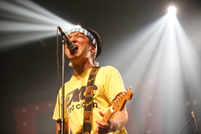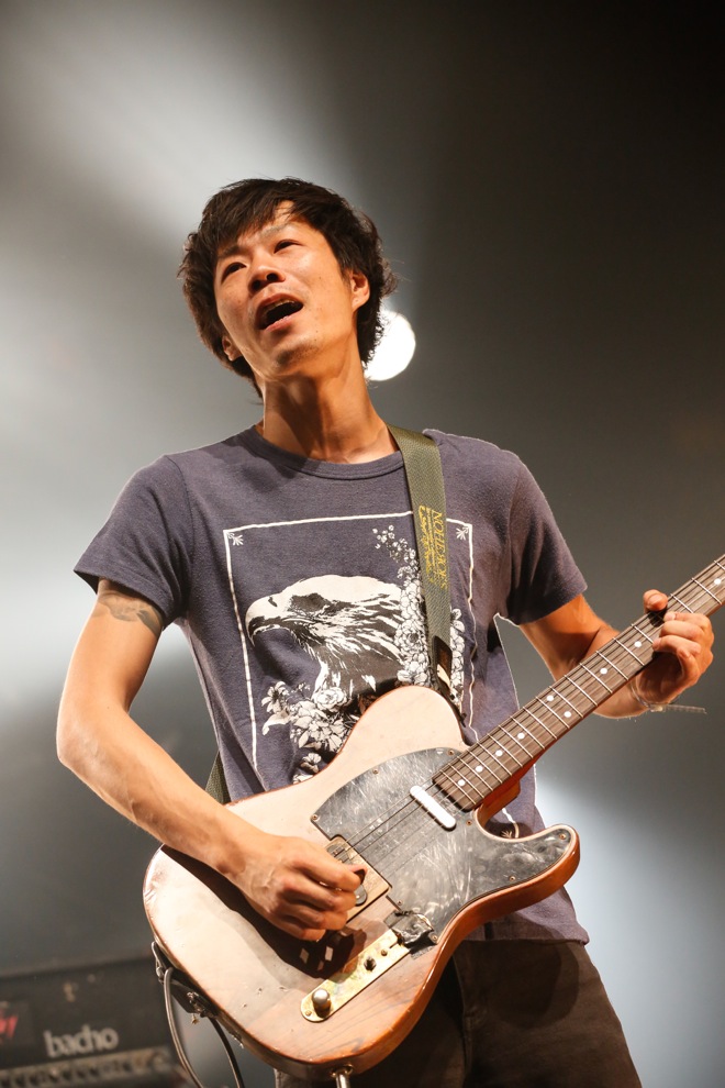 柔らかなアンサンブルから、徐々に感情が高まりを見せていく「最高新記憶」は、まさにその真骨頂。途中では伊藤知得(B)もユニゾンで歌い、より力強い歌を会場全体に響き渡らせていた。曲を終えると、「まさか俺達がここに立てると思ってなかったのでビックリしました。でも、時間とステージをもらったからには、“今日bachoが一番よかったな”って帰る奴が出来るだけ多いようにやります」と、北畑が真摯にコメント。それでいて演奏はとにかくダイナミックで、クラウドサーファーも現れた「決意の歌」では、北畑がハンドマイクでステージ前まで出てきて、熱く言葉をぶつけて行く。