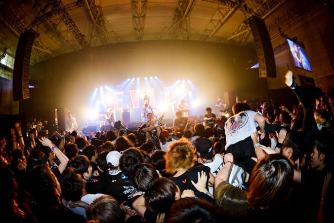 しかし、ファンの反応が予想していた以上に熱かったのか、バンドは“おまえらまだやれんのか? やるつもりはなかったけど”(Ryo)と予定になかった「Rollin’」を〆に披露。ヒップホップの影響が窺えるハードコア・ナンバー。跳ねるリズムに観客は両手を挙げ、ツーステップを踏み、そして掲げた両手を大きく左右に振った。