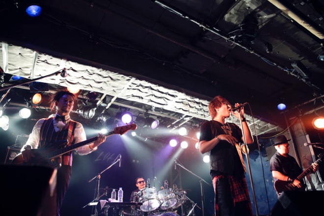SEX PISTOLSやLED ZEPPELINのBGMでレイドバック感満載だった場内に、アルバム『JET SET BOYS』の1曲目「HI!VOIR」が流れ、4人のメンバーが登場。フロアは待ち構えていたようにSEに手拍子を重ね、彼らの初陣を華やかに出迎えた。そのSEを食うように前のめり気味に4人の演奏が始まると、フロアは積極的に自分たちのノリ方を作っていく。このリアクションにはメンバーも大喜びだ。サングラス越しに客席を見つめていた高橋が満面の笑みを浮かべた。そして、2曲目が高橋の“ワンツースリーフォー!”というカウントから勢いよく飛び出した。
