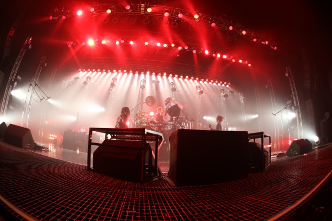 絶望の淵から彷徨い出るように流れ出した黒い演奏。巨大なスクリーンには音がブレイクするたびにメンバーの姿がシルエットで浮かび上がっていた。幕が降りると、miyakoの歪みを上げたギターと衝撃を与えた破裂音を合図に、DEZERTのライヴが始まりの咆哮を上げた。緩急活かした暗鬱な『「あー。」』に合わせ、会場中の人たちが一斉に頭を振りながら暴れていく。「この歌には救いはない」「この場所には救いはない」。救いがないなら狂えばいい。舞台上の絶叫に立ち向かう形で騒ぎ奉ればいい。