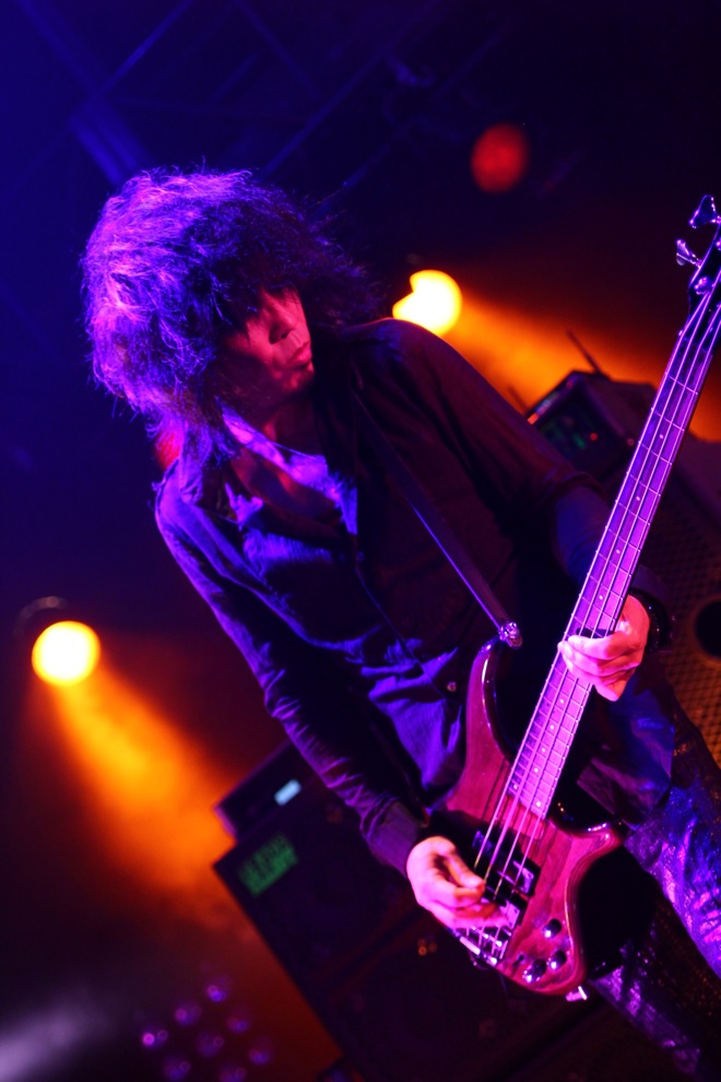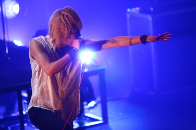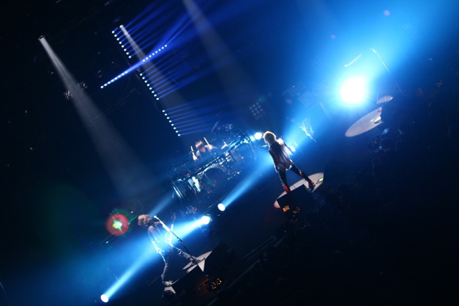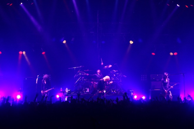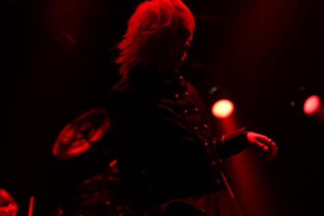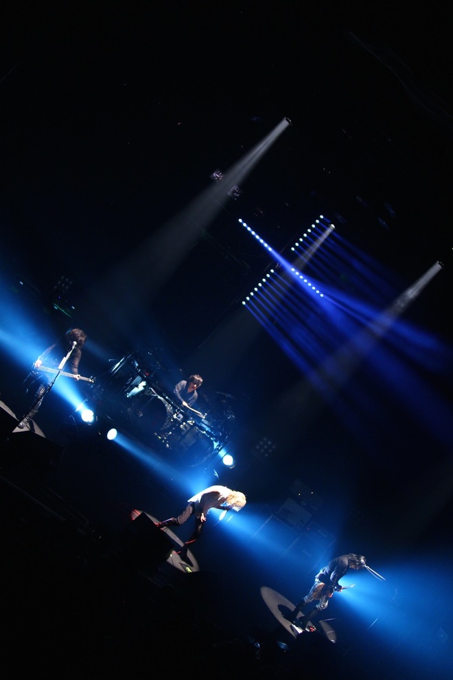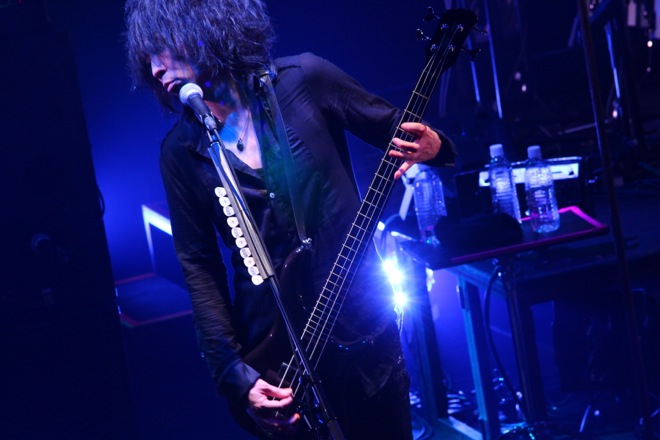 場内が暗転すると、ステージを覆う白幕に、十字架をかたどった照明がにじむ。オープニングSEに据えられていたのは「NOIR-C’est La Vie」。幕が消え、全景が露わになったステージ上の配置についた4人がまず炸裂させたのは「NOIR-D’amour」だ。kyoのシャウトが閃光のごとく闇を裂く。雷鳴のようなドラムとともに体感速度を増すこのオープニング・チューンは、先述のSEともども2007年発表の復活作、『LAZZARO』からの選曲によるもの。さらに、その余韻のなかで赤い闇に包まれながら聴こえてきたのは『D’ERLANGER』(2009年)に収められていた「Love me to DEATH」だった。