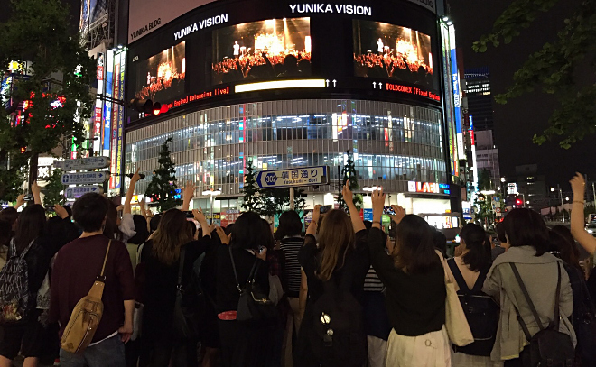 生中継された街頭ビジョンは、新宿アルタビジョンとユニカビジョン、札幌メガビジョン 4プラ、 名古屋インタービジョン 、大阪トンボリステーションのほか、渋谷や福岡 など 5都市。 その中でも新宿ユニカビジョン前では 500人以上のファンが駆けつけ、 その他、大阪道頓堀の他、名古屋、札幌などの全国各所の街頭ビジョンに駆け付けたファンは 1000人を超えた。
