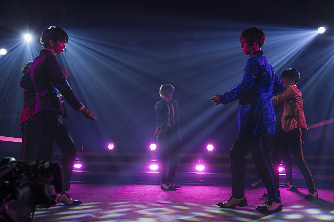 3月からスタートした16公演の最後を飾るこの日のタイトルは“Body&Groovin’”。客電が落ちるとお馴染みのSEの代わりにステージの左右に構えたバンドがロックなセッションを鳴らし、幕開けの曲「No.1」でコーイチとタカシがフェイクの利いた歌声を聞かせると、想像を絶するアダルトなアレンジに場内は沸騰。さらに、ステージにライトが当たって5人のダンサー陣が姿を現せば、悲鳴のような歓声が湧き上がる。「SAY超特急!」というカイの煽りからスタートした新曲「DJ Dominator」でもファンクなフレイバーを存分に取り込み、自己紹介のMCを挟んでタクヤの「Are You Ready?」の煽りに生ドラムの音が重なる様は、まさにロックバンドのステージのよう。おなじみのナンバーも画期的なバンドアレンジにより別物のように生まれ変わって、曲が始まるたびに驚きと喜びのどよめきが客席に沸き起こる。