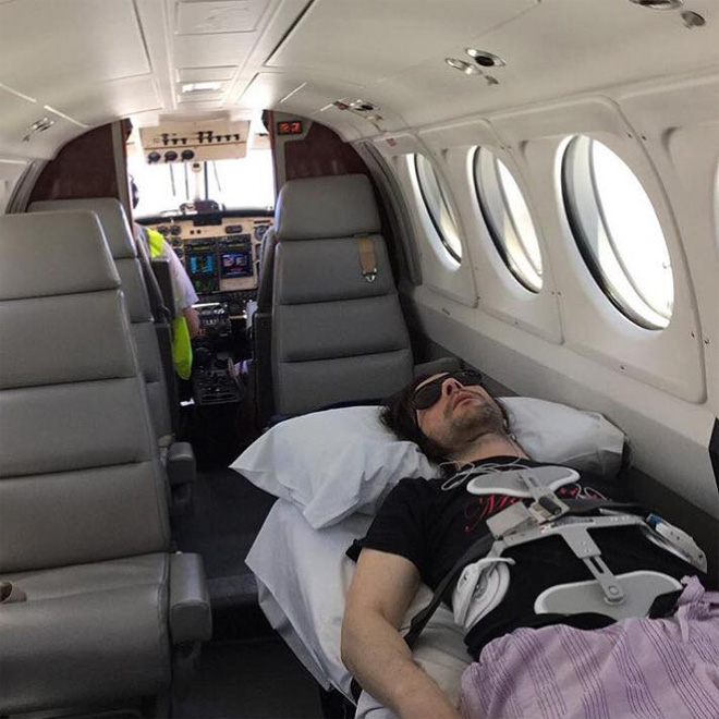 ボビーは先週木曜日(6月2日)パフォーマンス中、高さ2メートルあるステージから転落。脊椎骨にひびが入ったほか、頭部を切ったと伝えられている。今週火曜日(6月7日)、救急輸送機でスイスから英国へ戻ったことが報告された。