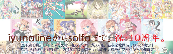 美少女ゲーム音楽を中心に作曲を提供し続けているsolfaは、2006年にiyunaline(イユナライン)として発足され、10年間で数多くのアーティストとのコラボレーションを繰り広げてきている。今では8名ものコンポーザー、プレイヤー、アーティストを抱え、年間20タイトルを越える作品の楽曲を提供し、オープニングやエンディングといったボーカル曲はもちろんのこと、BGM制作まで幅広くカバーする実力派集団だ。