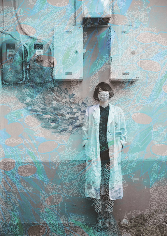 このジャケットは、先日下北沢で行われたサーキットイベント<Shimokitazawa SOUND CRUISING 2016>にて、カノエラナのライブ中にライブペインティングでコラボした音楽系イラストレーター“フクザワ”氏による作品だ。イベント当日は、フクザワ氏の手により、わずか40分のライブの間にこの白い三角巾が鏤められた可愛らしいアートワークが完成した。この模様はイベント来場者からSNSに次々と投稿され、大きな話題を呼んだ。