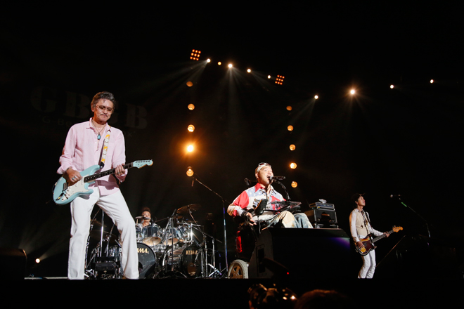 アンコールでは「GBGBのきっかけ、ROGUE再結成のきっかけを作ってくれたROGUEにとっての恩人」という紹介と共に桜井和寿が登場し、ROGUEとの共演が実現。<ap bank fes ’12>では、体温調節や褥瘡の問題などの理由で、奥野が歌う映像と共に桜井による「終わりのない歌」が披露されたのだが、4年越しの悲願とも言える今回の共演で歌われた「終わりのない歌」は、無条件で人々の心を打つものがあった。改めてあたたかい曲だと感じるのと同時に、同じ歌を共有しながら笑顔で歌うふたりの姿には、純粋な「生への共感」を見出すことができた。発声法を変えざるを得ない奥野の歌は、「終わりのない歌」が発表された当時のROGUEを知っているファンにとっては異なる歌声なのかもしれない。でもそこには、人生の雨を一旦経験し、新たな世界を歩み出した奥野だけが持つ説得力が存在していたのだ。