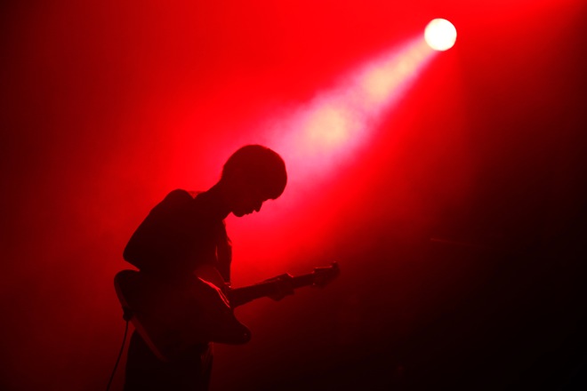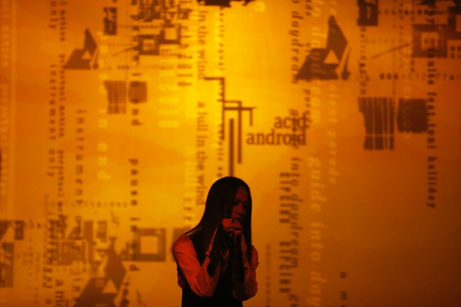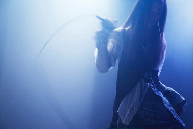 新曲も並んだ中盤は、映像や照明などの演出も加わって、無機質なデジタル感で攻撃的にスピードを上げていく序盤とはまた違った、エモーショナルな抑揚のあるステージになっていった。ワイドなステージの壁すべてに映像を投影し、ノイジーなギターとヘヴィなビート、そして雰囲気あるヴォーカルとが生む「double dare」の世界観を引き立てていく。「unsaid」から2曲の新曲(「new song #1」「new song #2」)、そして「swallowtail」などは、それまでハンドマイクで体を振り絞るようにして歌い上げていたヴォーカルスタイルから、スタンドマイクを使い、より丁寧にディテールを歌い上げるようなパフォーマンスで魅せていった。インダストリアルな音響と、アンニュイな80年代ニューウェーヴ・サウンドとが融合した「swallowtail」から優美な「new song #2」へとドラマティックに展開していくパートは、じつに美しく甘美。オーディエンスはどっぷりと、その世界に酔いしれていった。