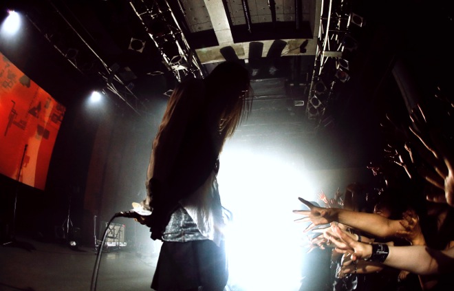 1曲目の「let’s dance」のハイパーなシーケンスサウンドと、ソリッドにタテのビートを刻む山口のドラム、KAZUYAのパンキッシュなギターによるアンサンブルは攻撃的で、フロア前方は激しいモッシュ状態に。yukihiroのアグレッシヴなヴォーカルが、オーディエンスの興奮にさらなる燃料を投下していき、大きなシンガロングや掛け声がコブシとともに上がっていった。続けざまに、「imagining noises」「daze」とブルータルなビートによる曲で会場をかき回すなど、序盤から気迫に満ち、スリリングなステージを繰り広げていく。MCこそないが、方々からあがる歓声や名前を叫ぶオーディエンスにスッと手を上げて応える姿も、また印象的だった。