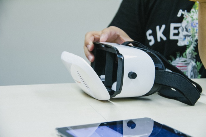 プロデューサー(い):じゃーこれを試してみよう。これはスマホをセットして、ヘッドマウントディスプレイにしちゃう道具なんだ。被ってみて。