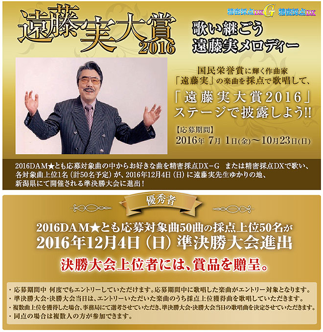 国民栄誉賞に輝く作曲家、遠藤実の楽曲を精密採点で歌唱して挑戦する「遠藤実大賞2016」がDAM★ともでスタートした。上位50名が、遠藤実ゆかりの地、新潟県で開催される準決勝大会に進出、ステージで歌うことができる。