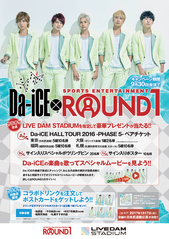 まずは、7月25日(月)~9月30日(金)の期間中にラウンドワンでLIVE DAM STADIUM指名すると応募券をプレゼント。ホールツアー「Da-iCE HALL TOUR 2016 -PHASE 5-」のペアチケット(大阪、福岡、北海道、東京)のペアチケット、サイン入りスペシャルボウリングピンやオリジナルポスターが当たる。