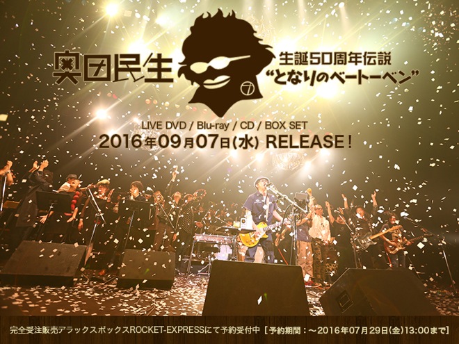奥田民生が9月7日、作品『奥田民生 生誕50周年伝説 “となりのベートーベン”』をリリースする。同作は2015年12月22日に開催した50歳のメモリアルイヤーを締めくくるスペシャルワンナイトショウ<奥田民生 生誕50周年伝説 “となりのベートーベン”>のパッケージ化となるもので、DVDやBlu-rayでの映像と、CD音源それぞれに同公演の模様が完全収録される。このたびその詳細が発表となった。