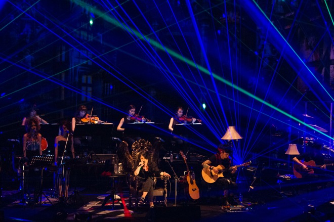 今回のライヴでは、演奏者はみなシックな衣裳に身を包み、マンハッタンの摩天楼を彷彿とさせるビル群を背景に、HYDE、K.A.Zに加え総勢10名のミュージシャンがアコースティック・セッションを繰り広げた。