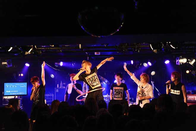 おそらくこの得点を下回ることはないのではないかと思われる中、次に登場したのはドラムのTakeshi。彼には「フラフープをしながら歌う」という指令が出たのだが、ややハードルが低めということで、1回落とすごとに1点減点されるというルールが急遽導入されることに。マイクのコードにフラフープがひっかからないようにHIKARU.がアシスタントを務める中、選曲した「残酷な天使のテーゼ」を歌いながら、勢いよくフラフープを回すTakeshiは、なんと、出だしのサビ部分を一度も落とすことなく熱唱!メンバーもカメコカメオも大興奮していたが、ライヴ後ということもあり、ただでさえ減っていた体力がぐんぐん削られ、その後はミスを連発。18点減点され、70.488点という好記録が52.488点になってしまった。