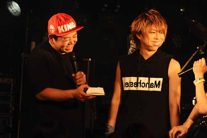 トリを務めたのは、こういった企画を行う際に、度々ミラクルを起こすことから「奇跡の男」と呼ばれているギターのDaisuke。「勝ちに行きますから」と豪語する彼が受ける「ちょっと過酷なこと」は、「洗濯バサミを顔や手につけて歌う」。しかも、洗濯バサミひとつひとつにヒモがくくりつけられていて、途中でおもいっきり引っ張られるという妨害込みで行なわれた。鼻、耳、腕、乳首などなど、身体中の至るところに洗濯バサミをつけられたDaisukeが選曲したのは、B’zの「ultra soul」。イントロではエアギターを披露する余裕を見せていたが、引っ張られてはまたつけられの繰り返しに、徐々にダメージが蓄積されていく。そして、サビのラストの「ヘイ!」のところで全身につけられた洗濯バサミを全部同時に引っ張られるという、選曲と指令が抜群の相性をみせたパフォーマンスで60.532点を獲得。結果、最下位となったTakeshiは、罰ゲームとして、バラエティの王道中の王道である「ゴムパッチン」をうけることとなった。ひたすらビビりまくりながらも、ステージ端まで伸びに伸びたゴムを顔面で受け止めたTakeshiは、ステージに崩れ落ちたまま「いはい(痛い)」とコメント。大盛り上がりの中、初日のステージを終えた。