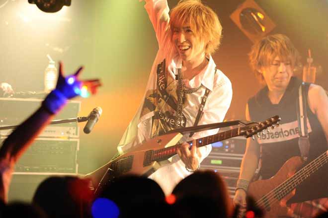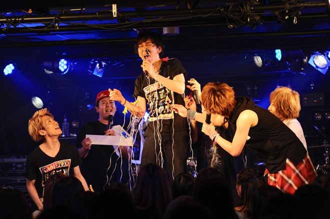 下手したらフロントマンが最下位になりかねない波乱の幕開けとなったカラオケ対決は、続いてベースのKouichiが登場。紙に書かれていた指令により、「口の中にマシュマロをいっぱい入れて歌う」こととなった。かなり大きめなサイズのマシュマロ4つを口に押し込み、カメレオの「時給¥850」を歌い始めたKouichiだったが、もちろんまともに歌えるわけがなく、むしろ、マシュマロをいつ吹き出してもおかしくない緊急事態に!「みんな気をつけて!」というメンバー達の絶叫と、逃げたくても超満員状態で逃げる場所がないカメコカメオ達の悲鳴と、口の中をパンパンにしたKouichiの「うーうーうー」といううめき声が混ざり合う阿鼻叫喚な空間となり、得点は57.793点と早くも最低記録を更新。腹いせなのか、自分の口から出したマシュマロをDaisukeの口にねじ込むという暴挙も飛び出した。