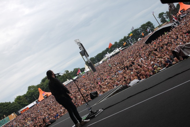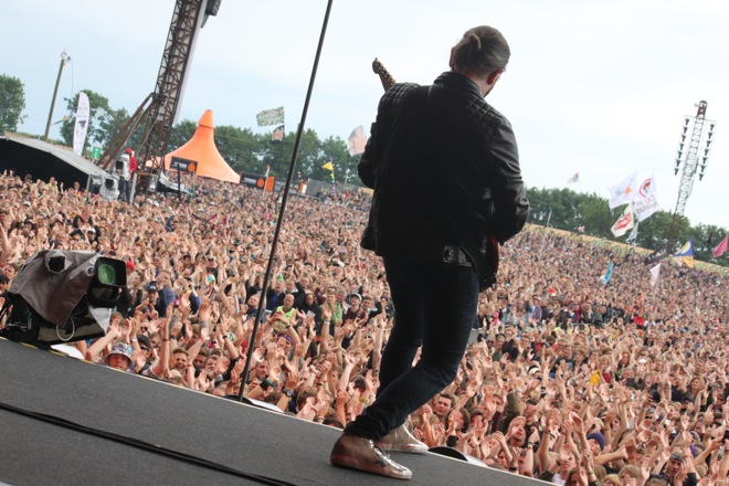この『ロスキレ・フェスティヴァル』は1971年から続く由緒正しい欧州最大規模のフェスのひとつ。開催地であるロスキレ(Roskilde)がそのままフェス名になっているが、かつて王族の拠点でもあったというこの古都は、デンマーク史の起点ともいわれる場所。その小さな町がこの時期だけは尋常ではない人口になるというわけだ。フェス自体の歴史にも、1970年に始まった英国の『グラストンベリー・フェスティヴァル』に匹敵するものがあり、デンマークを拠点とする数多くのアーティストたちのみならず、世界的なビッグ・ネームも数多く集結する。今年は6月25日から7月2日にかけて開催され、各日のステージにはレッド・ホット・チリ・ペッパーズ、LCDサウンドシステムをはじめ、ニール・ヤング、ニュー・オーダーからデーモン・アルバーン、スレイヤーに至るまでのさまざまな顔ぶれが出演。ディジー・ミズ・リジーは公演最終日にあたる7月2日の夕刻、広大な会場敷地内でもメイン格の規模といえるオレンジ・ステージに登場し、一帯を埋め尽くした大観衆を沸かせた。