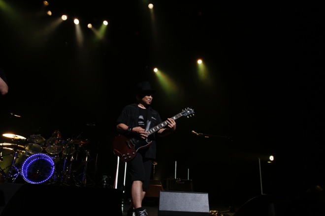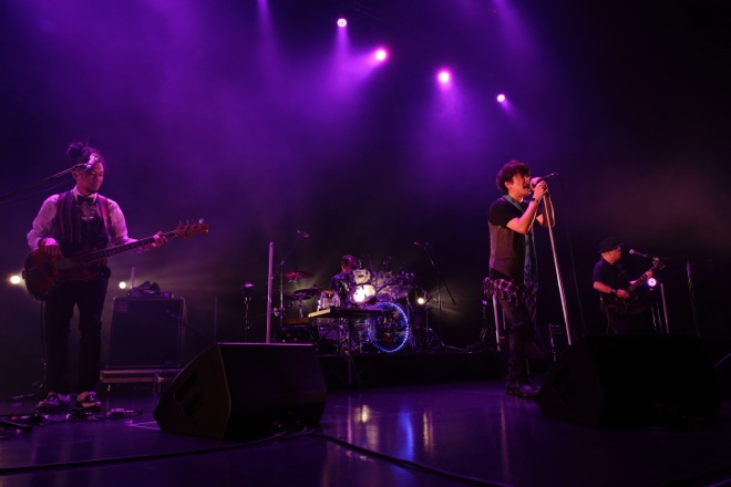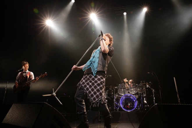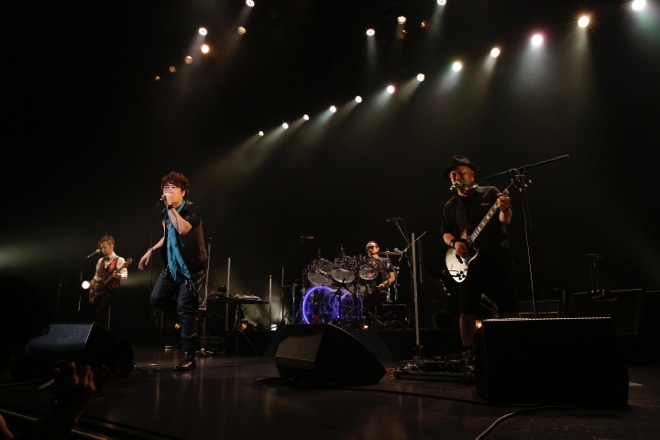 17時、開演時間になると往年のロック王道ナンバーを流していたBGMがアルバム『JET SET BOYS』のオープニングを飾るインスト曲「HI!VOIR」にシームレスにスライドすると、メンバーが次々と舞台に登場。今回は、これまでのライブハウスとは違ってステージ幅も奥行きもあり、フロアはシーティング仕様になっているなど、椎名慶治(Vo)曰く「舞台も客席も、ご年配にもやさしい親切設定」だ。