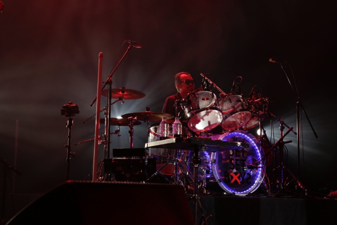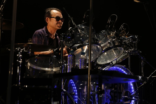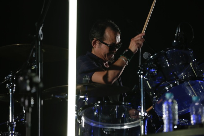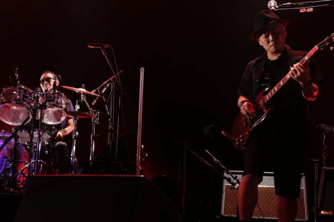 その化学反応がツアーでさらに色濃く出るようになったのが次の曲だ。高橋が椅子から立ち上がり、メンバー4人が大声で“ウォーオーオー”とシンガロングするところから始まる「GET SET」は、高橋の少し前のめり気味のビートとtatsu(B)が鳴らすファンキーなトリッキーフレーズが混ざり合って独特のうねりを場内に作り出す。それをステージ前方に出ていった椎名が“1、2、3〜”とカウントして歌う歌詞のなかで最もキャッチーな部分を客席にふって歌わせるなど、ベテランならではの粋なテクニックで次々と観客を魅了。高橋はトレードマークのサングラスをかけ、その様子を笑顔で後ろから見守る。