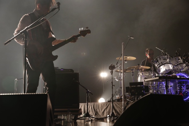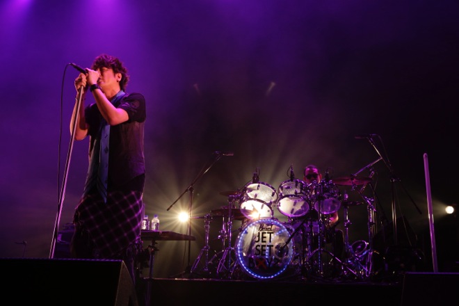 開演と同時に椅子席から立ち上がったファンは、“タンタン”と高橋のスネアが聴こえてくると一斉にハンドクラップを鳴らし、ライブは「ZIPPER DOWN」で勢いよく幕開け。そこからアルバムと同じように「LAVIATHAN」へとつないで、歌詞同様“強く速く熱い”サウンドで、縦ノリと横ノリが混ざり合ったようなJET SET BOYSならではのビートを堂々見せつけていく。